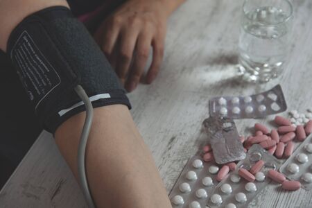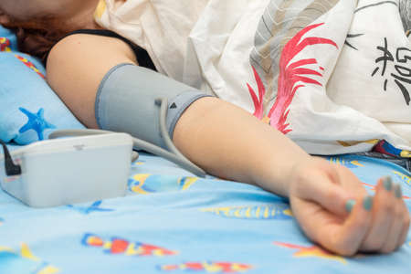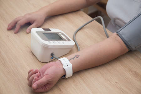 Female check blood pressure and heart rate with digital pressure gauge standard blood pressure test results
