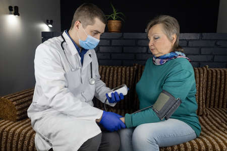 Cardiologist doctor measures blood pressure of a senior woman. Device for self-diagnosis and control of the heart. High or low pressure. Hypertension or hypotension. concept of cardiovascular disease
