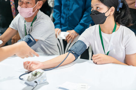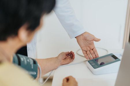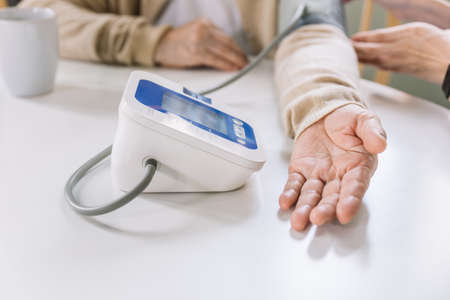 Close-up of an elderly Asian woman's hand measuring blood pressure by using automatic blood pressure monitors with a nurse. Caregivers visit homes. Home health care ideas and nursing homes.