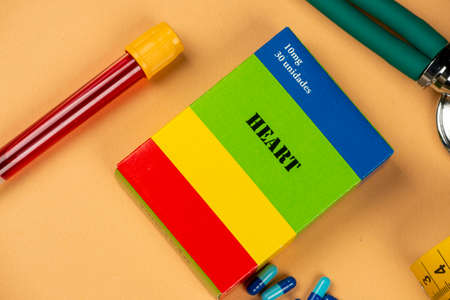 Concept of health, blood pressure. The word hypertension, an electronic blood pressure monitor, tablets and a tissue heart on an orange background. The view from the top.