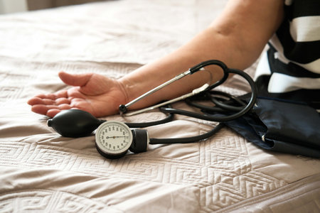 Monitoring blood pressure is essential for health management, especially for elderly. This shows close up of arm with blood pressure monitor, highlighting importance of regular health checks.