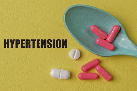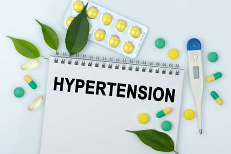 On the table are pills, a thermometer, leaves and a notebook with the inscription -HYPERTENSION. The concept of medicine.