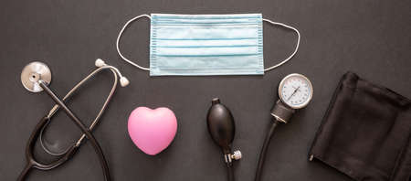 Blood pressure meter, medical stethoscope and protective face mask on black color background. Coronavirus protection and treatment concept.