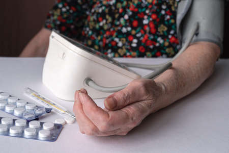 Senior woman taking measures blood pressure at home. Old hand close up. Self care of elderly health.