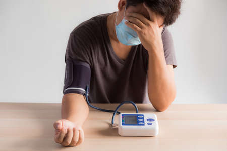 stressed man measured his blood pressure with a handheld device and found the pressure was higher than normal