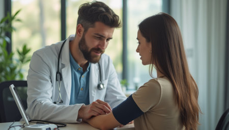 A healthcare worker is seen holding a blood pressure gauge, focused on ensuring accurate measurements for patient health. The setting is a medical facility filled with equipment.