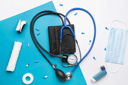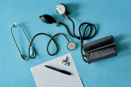 White sheet paper with black pen and colored different pills, capsules, phonendoscope stethoscope, sphygmomanometer on blue background with copy space for text. Medicine consept.