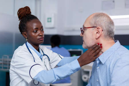 African american doctor checking on senior patient healthcare in medical cabinet. Black person with medic profession looking at old sick man sitting at desk for examination appointment