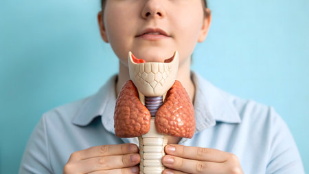 A person uses an anatomical model to demonstrate the location of the human thyroid gland in the neck. This visual aid is perfect for medical education, helping students and patients understand the endocrine system and its vital functions related to health