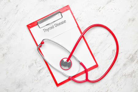 Clipboard with text THYROID DISEASE and stethoscope on white background