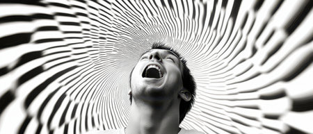 A man with an open mouth expresses emotion enveloped in a swirling black and white pattern that enhances the dynamic scene.