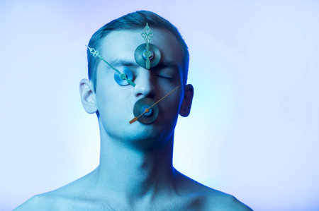 portrait of a guy, gears and clock hands on his face
