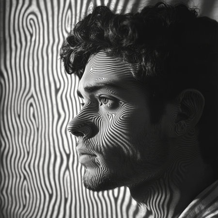 Black and white artistic portrait of a man's face, illuminated by striped lighting that creates a hypnotic optical illusion effect, symbolizing creativity and abstract concepts.