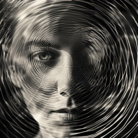 A black and white photo of a face in the center of an abstract spiral, AI