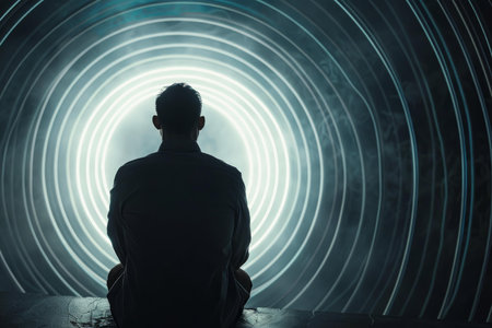 A persons silhouette stands before a mesmerizing, glowing circular portal, creating a sense of mystery and wonder.