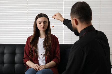 Psychologist using pendulum while working with patient during hypnosis session indoors