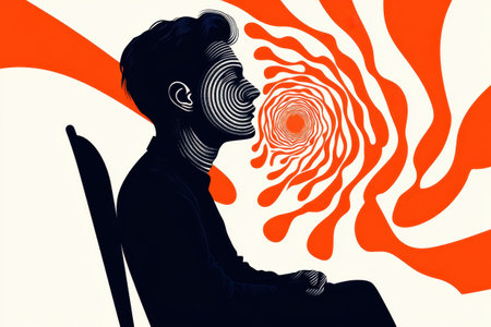 A silhouette of a person sits in profile, surrounded by dynamic swirling patterns in vibrant orange.