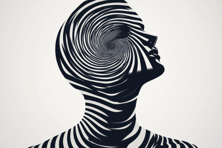 A striking silhouette of a person is depicted with swirling black and white stripes that create a mesmerizing spiral effect. This artwork stimulates thoughts of creativity, introspection, and emotional depth, engaging viewers completely.