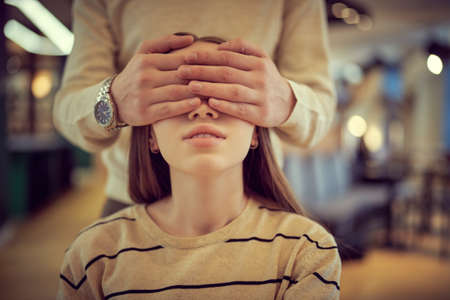 Portrait of male hands closing the eyes of a beautiful girl sitting at a table in a cozy cafe. Love and relationship, lifestyle. Date in a cafe.