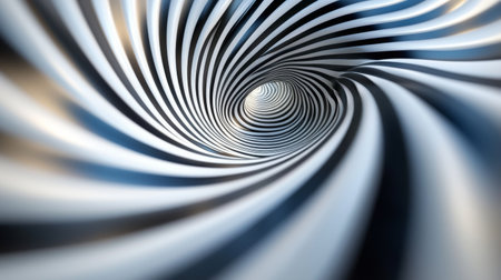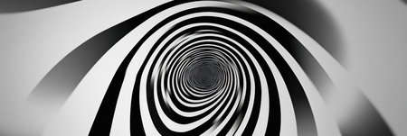 Dynamic abstract spiral featuring alternating black and white stripes creating a hypnotic tunnel effect with depth and motion.