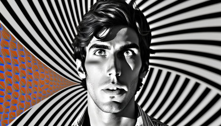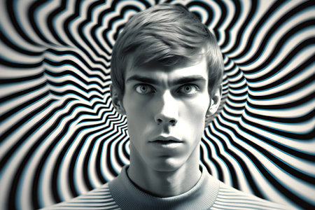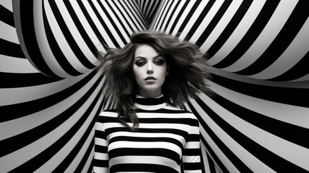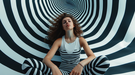 Model posing near optical illusion in black and white with hypnotic target on eye