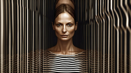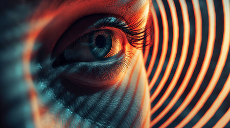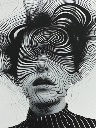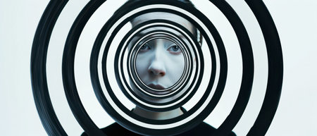 The image features a woman's face, partially obscured by a series of concentric black and white circles. The circles create a hypnotic effect, drawing the viewer's attention to the woman's eye and the surrounding area. The background is a simple white, allowing the abstract pattern to take center stage.