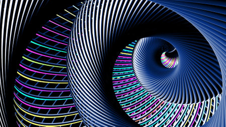 3d render. Abstract dark background with curved lines like tubes twisted in helix and multicolor neon light on tubes. Round composition. Abstract spiral