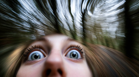 A striking close-up of a person's surprised face with wide eyes set against a beautifully blurred background, capturing raw emotion and an artistic perspective.