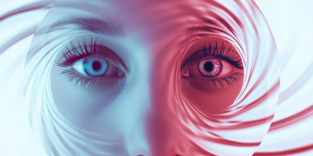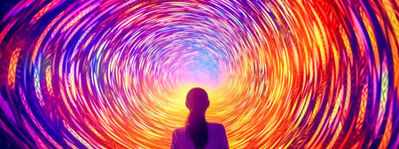 portrait of a woman in hypnosis, colorful abstract world of illusion, banner