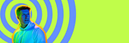 Young happy smiling looking away isolated over bright yellow abstract background in neon light. Concept of beauty, fashion,ad. Flyer