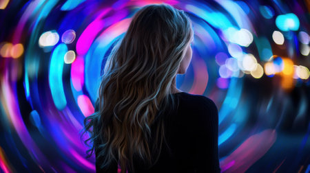 A woman with a tied-back hairstyle stands in profile against a vibrant backdrop of swirling lights. The colors of red and white create a dynamic effect as they spiral around her figure, highlighting her silhouette. The scene evokes a sense of wonder and movement, capturing an enchanting moment during nighttime.