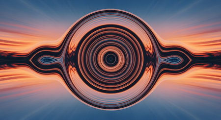 A colorful, abstract, and symmetrical digital art piece created from a warped sunset. The image features concentric circles and flowing, liquid-like shapes in vibrant orange, deep blue, and black, creating a hypnotic or psychedelic effect. The glowing orange light radiates from the edges towards the dark, circular center.