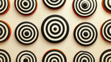 A visually striking arrangement of circular targets featuring bold black and white patterns. The design emphasizes symmetry and repetition, creating a captivating aesthetic suitable for various creative projects.