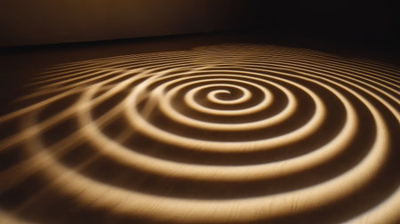 This captivating image features intricate light patterns forming spirals and shadows on a wooden floor, creating an artistic and tranquil atmosphere.