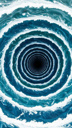 A deep blue and white swirling vortex creates a tunnel effect, drawing the viewer into a dark, infinite abyss.