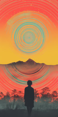 a man stands on a hill, his face partially obscured by a circular pattern. this photo captures the essence of color-field abstraction, with bold lithographic elements reminiscent of himalayan art. the image exudes a sense of calm and meditation, enhanced by the glassy translucence and expansive landscapes. vintage imagery adds a touch of nostalgia to the composition. ai generated