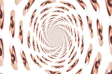 A decorative medical illustration about audition and hearing with many ears on a white background