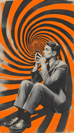an iphone xr with a black holographic screen featuring a mesmerizing swirl design. this op art-inspired optical illusion creates a psychological phenomena illustration with minimalist black and white drawings. the bold gestures and horror-inspired elements add a touch of realism and attention to detail, while the circular shapes enhance the overall visual impact. ai generated