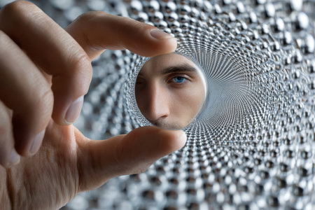 A person observes the world through a circular lens, creating a fascinating visual effect and depth.