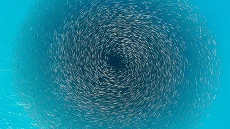 In the clear blue depths, a massive school of fish moves as one, creating a mesmerizing circular vortex. This incredible display of natural teamwork and unity showcases the power of collaboration and survival strategy in the vast, beautiful underwater world.