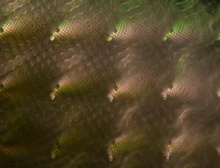 Silver fish swimming together in an aquarium, creating mesmerizing wave patterns that enhance the tranquil underwater environment