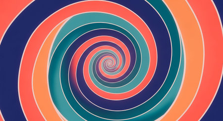 A striking abstract pattern characterized by a bold, geometric spiral. The distinct bands of coral orange, teal, and a deep navy blue, creating sharp contrasts. The spiral recedes with clean lines, offering a strong sense of depth and a hypnotic, dizzying effect. composition is reminiscent of vintage aesthetics.