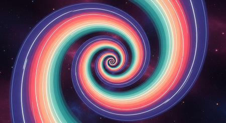 An abstract representation of a cosmic spiral galaxy or a psychedelic vortex set against a dark, star-filled nebula background. The spiral is formed by a spectrum of rainbow colors, outlined with a bright white glow, suggesting movement and energy. The overall effect is otherworldly and dreamlike, with a distinct retro or vintage feel due to the color choices and stylistic rendering.