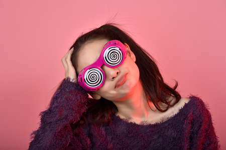 Hypnotized woman, closeup. Spiral symbolizing hypnotic effect