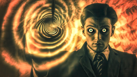 A man with his head tilted back appears entranced by a swirling light pattern creating a sense of disorientation and fascination.