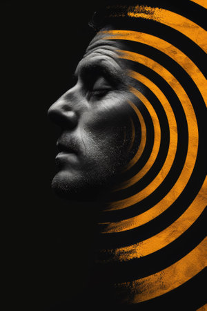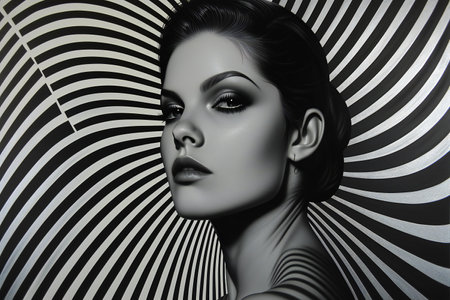 A surreal artwork featuring a person with mesmerizing optical illusion patterns on their face, creating a stunning visual effect and showcasing creativity, art, and contemporary design influences.