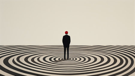 a man stands in front of a white background, surrounded by a black and white spiral. this surrealistic landscape features bold graphic illustrations with a touch of nostalgia and minimalism. the red and beige colors add a striking contrast to the orderly symmetry of the image. the high horizon lines capture a decisive moment in this captivating composition. ai generated