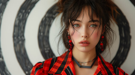 Young Woman With Long Black Hair Posing in Red Plaid Shirt Against White and Black Circles