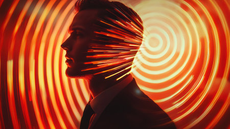 Silhouette of man facing hypnotic circular light patterns in darkness.