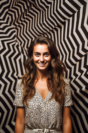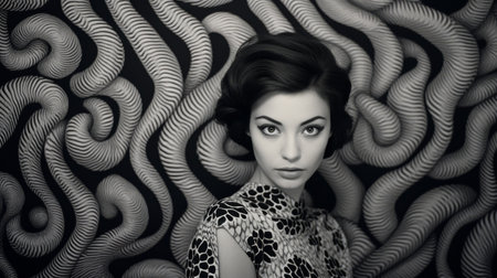 the young girl is posing for a photograph with a black and white swirled pattern, reminiscent of artists like casey weldon and melvin sokolsky. the illusionary wallpaper portraits and intense color saturation create a captivating gaze, similar to the style of andrea mantegna, with realistic forms. ai generated